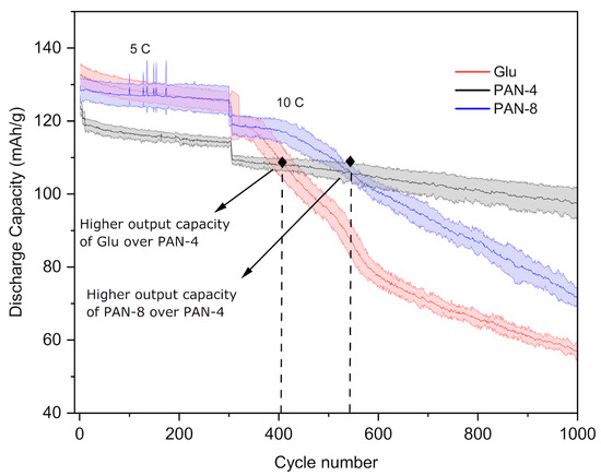 Analyzing the high C-rate performance and cycling stability for PAN-4, 8, and Glu, depicted in Figure 7, one could notice a lower output capacity of PAN-4, but higher cycling stability. PAN-8 and Glu have almost the same electrochemical response at 5C, albeit different capacity fade profiles at 10C. In contrast to PAN-4, Glu demonstrates a higher discharge capacity until the 400th cycle, but after that, a dramatic capacity fade reproducibly occurs. Thus, PAN-8 is more stable than Glu and delivers decent electrochemical response even after 500 cycles, but then capacity retention of the sample starts decaying fast. PAN-4 capacity retention could be characterized as a linear decrease in the discharge capacity. The material exhibits 98 ± 4 mAh/g after 1000 cycles of the combined 5C and 10C cycling protocol, which is 27% higher than PAN-8 and 40% higher than the Glu sample.