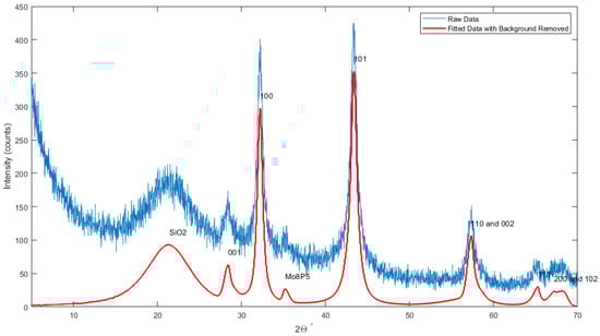 The XRD plot shows peaks at 28.0, 32.2, 43.1, 57.2, 65, and 67.4, which have been reported previously for the hexagonal phase of MoP; the results are also in agreement with JCPDS (24-771) diffraction data [,]. In addition to the MoP peaks, two weaker peaks were also recorded. These additional peaks were found to belong to the phase of molybdenum phosphide (JCPDS 26-1274). Formation of under high pressure has been reported previously []; however, the ALD process is a non-equilibrium growth process (flowing only one source at a time), unlike conventional growth processes. Hence, presence of the in ALD growth is not surprising.