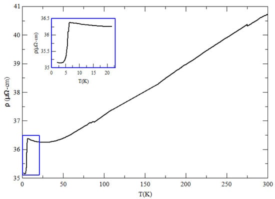 The transport properties of carriers were examined using samples of approximately 1 cm × 1 cm that were cleaved from larger substrates. The film thickness of these samples was 24 nm. Indium solder was used to connect Cu wires along the edge of these substrates in a Hall bridge configuration. First, the longitudinal resistivity () of the film was measured versus the temperature, as shown in Figure 3. As expected, the resistivity of the film decreased as the temperature was lowered, indicating a metallic film. It is interesting to note that at about 6 K, there was a sharp drop in resistivity, but it did not reach zero. This feature was repeatable and we believe this indicates the presence of a partial superconducting phase. This TC temperature is in agreement with the TC value of (5.8 K) that was reported for in []. From the XRD data, it is clear that the amount of the phase comprises only a small fraction of the sample; therefore, the residual resistance is attributed to non-superconductive MoP (TC = 1 K) and indium (TC = 3.4 K), which was used to contact the wires with the sample.