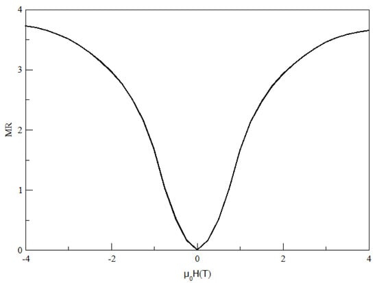 Electron transport in topological semimetals is strongly affected by the external magnetic field (B); hence, the measurement of magnetoresistance (MR) is commonly used as a signature indicator. The magnetic field dependence of both longitudinal and Hall resistivities were determined by applying the field perpendicular to the sample surface. The magnetoresistance for both transverse and longitudinal current transport were measured at a constant temperature of 1.8 K, where magnetoresistance (MR) is expressed as a change in resistivity due the field divided by the resistivity at zero field, i.e., . The field dependence of the MR for the longitudinal current transport is shown in Figure 4. At lower magnetic fields, there is a parabolic relationship between the applied magnetic field and the magnetoresistance. The parabolic profile of the plot of MR and the field is one of the characteristics of topological semimetals. This can be shown by using the following expression to determine resistivities with and without the field [,]: