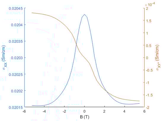 The Hall conductivity () and the longitudinal conductivity () at 1.8 K were extracted from their resistivities using the following relationships: and []. The experimental setup measured the magnitude of Hall voltage on the contacts; thus, for the Hall conductivity we first removed the contact resistance background and then inverted the sign of conductivity at the crossover (B = 0) field. The Hall and longitudinal conductivity are plotted against the magnetic field in Figure 5. In both cases, the largest change in the conductivities occurs at low fields where the magnetoresistance is low.
