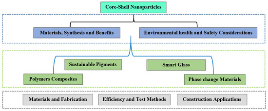 Flow chart of core-shell nanoparticles, synthesis, efficiency and construction applications.