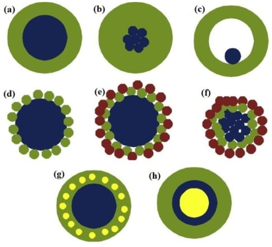 Figure 2 shows three forms of shell structure like a continuous layer (Figure 2a–c), a larger core sphere that contains many smaller spheres (Figure 2d,e) or simply a collection of core spheres (Figure 2f) [40]. The intricacy of the core-shell structure can be manipulated by inserting smaller spheres into the shell (Figure 2g) [41] that can also be done through multiple shells (Figure 2h) [42,43]. The core-shell NPs can be made using the physical or chemical approach including the chemical deposition, physical vapour and wet chemistry. Generally, the synthesis of core-shell particles involves different stages. First, the core particles are synthesized followed by the formation of shell onto the core particle. This method depends on the type of core and shell materials [41]. The main purpose of producing the core-shell particles is to achieve suitable unconventional novel materials and structures. Consequently, the materials with desirable attributes such as active particles with high stability, biocompatibility and synergy effect can be achieved [44].
