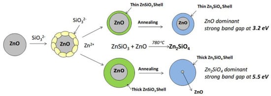 Figure 3 shows the sol-gel unified annealing approach used by Li et al. [55] to produce ZnSiO3/ZnO core-shell NPs. In this experiment, the reason for combining these two methods was to produce broad band-gap core-shell NPs of Zinc Silicate-Zinc Oxide (Zn2SiO4@ZnO). First, the reaction between Na2SiO3/ZnCl2 was initiated to form ZnSiO3, which in turn produced the shells with varied thickness before being used to coat ZnO NPs. A low annealing temperature of 780 °C was set. Finally, the reaction between amorphous ZnSiO3 and ZnO occurred, forming a crystalline Zn2SiO4 shell. Chai et al. [45] adopted this technique to make core-shell Fe3O4@SiO2 NPs. The first step was to fabricate Fe3O4 NPs via the solvothermal technique. Next, the hydrolyzation of tetraethyl orthosilicate resulted in SiO2 that acted as the coating agent for Fe3O4 NPs.