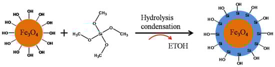 Chae et al. [45] produced Fe3O4@SiO2 by the customised Stober method. The solution of 4 g Fe3O4 particles was ultrasonicated and extra tetraethyl orthosilicate was added to raise the volume from 4 to 40 mL. A stable emulsion was obtained and it was further inserted into a mixture containing 50 mL of ethanol and 12 mL of NH3 H2O. The reaction solution was stirred at 400 rpm at room temperature for 4 h until the core-shell structured Fe3O4@SiO2 NPs were separated using centrifugation. Figure 4 shows the entire process of Fe3O4@SiO2 synthesis.