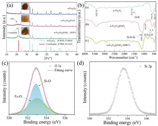 (a) XRD patterns and (b) FTIR spectra of different samples; high-resolution XPS spectra of (c) O 1s and (d) Si 2p for α-Fe2O3@SiO2 pigments calcined at 1000 °C [88]. Reproduced with permission from Chen, S., et al., Applied Surface Science; published by Elsevier, 2020.