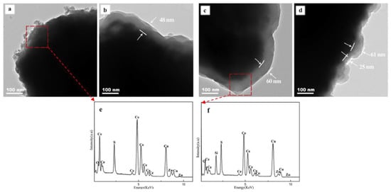 Li et al. [47] conducted an analysis on the synthesized γ-Ce2S3@SiO2 core-shell materials using TEM test. The TEM images in Figure 6 show the silica shell being formed at various coating times. A clear layer covers the γ-Ce2S3 but it is not found on the samples that are not coated, which is in accordance to the SEM analysis. Figure 6b–d shows a correlation between the increasing thickness of the coating layer and increasing coating times. It was demonstrated that when the particles were coated once, twice and thrice times, the thickness was increased to 70 nm, 100 nm and 140 nm, respectively. This clearly indicated that it is possible to control the coating thickness through number of coatings being applied.