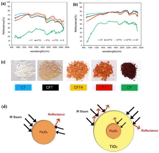 Figure 8 shows the reflectance spectrum measured by Sadeghi-Niaraki et al. [98] for the as-produced Fe2O3@TiO2 with crystallite size (nm) of CT (32.2 nm), CFT2 (31.4 nm), CFT4 (28.4 nm), and CFT5 (13.3 nm) samples. CT sample showed that the reflectivity at wavelengths improved which was due to the increase in the crystallinity of the emergent rutile phase. After the calcinations, the reflectance value increased as the sample experiences the crystallisation. Figure 8c shows that the presence of Fe2O3 produced darker hues within the samples in addition to NIR reflectance being reduced. The NIR solar reflectance for the samples was CT (76%), CFT2 (73%), CFT4 (68.8%), CFT5 (68.4%) and CF (39.3%). Figure 8d shows the IR reflectance process within Fe2O3–TiO2 and Fe2O3 particles.