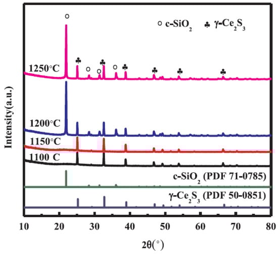 Li et al. [99] tested the high temperature tolerance of the red pigments made from Ce2S3@SiO2-based core-shell NPs. Figure 9 shows the XRD patterns related to the γ-Ce2S3@c-SiO2 samples, where their production was subjected to various calcination temperatures. There is an absence of the commonly found SiO2 diffraction peaks when the calcination temperatures occur at the range from 1100 °C to 1150 °C. However, the diffraction peaks occurred during the γ-Ce2S3 crystalline phase. This means that SiO2 failed to crystallize. However, c-SiO2 diffraction peak initiated as the temperature reached 1200 °C. This suggests that SiO2 will only crystallise within Ar gas atmosphere when temperature reaches 1200 °C. c-SiO2 diffraction peak’s intensity remains approximately at constant level as temperature is further raised to 1250 °C. Therefore, c-SiO2 is prone to crystallisation when two conditions are met; (a) it is within Ar-gas atmosphere (b) temperature to be at least 1200 °C. In another study, Li et al. [100] analyzed the γ-Ce2S3 red pigments’ resistance through XRD test.