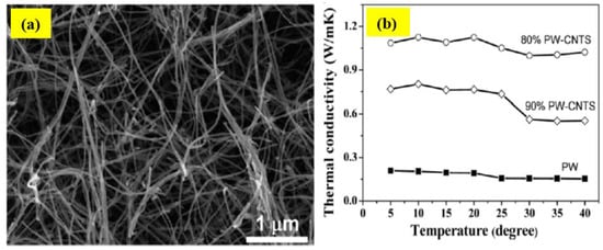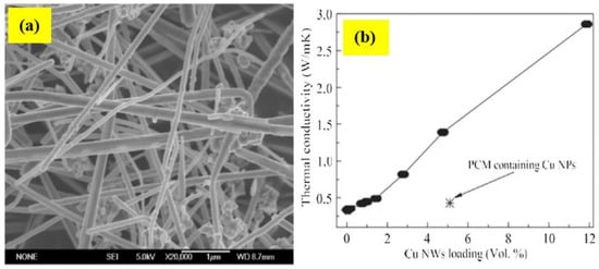 (a) SEM photos of synthesized CuNWs. (b) Thermal conductivity of PCM composites with increasing CuNWs loadings [107]. Reproduced with permission from Zeng, J.-L. et al., Solar Energy Materials and Solar Cells; published by Elsevier, 2012.