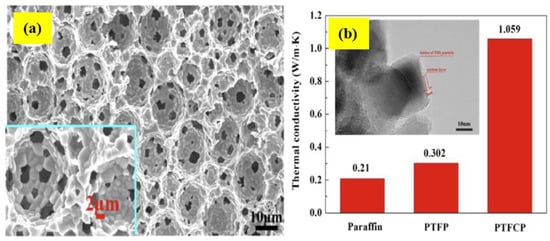 (a) SEM images of PTF. (b) Enhancement of thermal conductivities of PCM paraffin, PTF/PCM, and PTFC/PCM composites by 43.8 and 404%. (Inset) TEM photo of the prepared PCM composite carbonized porous TiO2 foams (PTFC) particles [122]. Reproduced with permission from Li, Y. et al., Applied Energy; published by Elsevier, 2016.