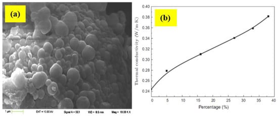 (a) SEM photos of PCM microcapsules with 27 wt% nano-alumina. (b) Thermal conductivities of PCM with various contents of nano-alumina [125]. Reproduced with permission from Jiang, X. et al., Applied Energy; published by Elsevier, 2015.