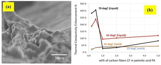 Shi et al. [132] used exfoliated graphite nanoplatelets (xGnP) and grapheme and improved the corresponding k values by 1000% and 100%, respectively. Such improvement resulted in the formation of paraffin PCM materials that are stable. Approximately 2 wt% of the graphene was added to paraffin and heated to around 185 °C. The paraffin retained its form despite reaching significantly high melting point. It was claimed that to decrease the cost, trace amount of graphene and xGnP can be doped together thereby improving both stability and heat dissipation of PCMs. xGnP-doped PCM resulted in a k value of 2.7 W/mK which was considerably higher than graphene-doped PCM (approximately 0.5 W/mK) and neat paraffin (0.25 W/mK). Wang J. [133] achieved 305% improvement in the PCM thermal conductivity by adding carbon nanofibers (CNFs) as nanofillers into the palmitic acid (PA). The phase temperature change was approximately 62.5 °C after the addition of unwashed acid. The range of length and diameter of the CNFs was 200–500 nm and 5–50 μm, respectively (Figure 15). Alkali potassium hydroxide (KOH) was used to chemically treat CNFs, reducing the thermal boundary resistance of the fibre matrix.