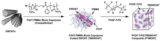 - Cho, K.Y.; Park, H.; Kim, H.-J.; Do, X.H.; Koo, C.M.; Hwang, S.S.; Yoon, H.G.; Baek, K.-Y. Highly enhanced electromechanical properties of PVDF-TrFE/SWCNT nanocomposites using an efficient polymer compatibilizer. Compos. Sci. Technol. 2018, 157, 21–29. [Google Scholar] [CrossRef]
