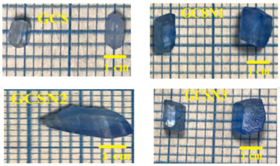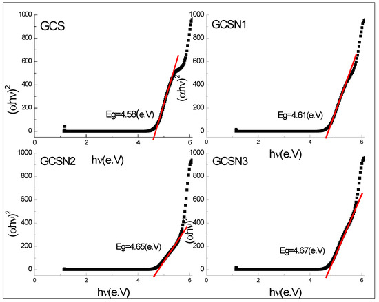 34]. Optical band gaps’ eV are 4.58, 4.61, 4.65, and 4.67 for GCS, GCSN1, GCSN2, and GCSN3 crystals, respectively. SNPs increased Eg and enhanced optical properties of GCS. High Eg indicated the decrease in the localized energy states on doping by SNPs due to extrinsic defects or disorders in GCS caused by interstitial doped SNPs [