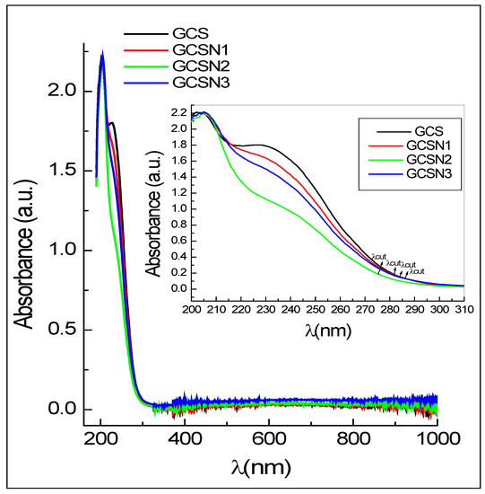 cut off 287 nm for GCS decreased to 283, 276, and 280 nm for GCSN1, GCSN2, and GCSN3, respectively, which indicated an increasing band gap. Blue shift of λ