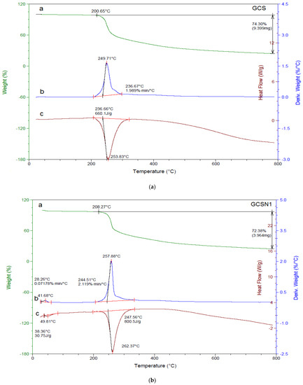 46]. TGA thermograms confirmed thermal stability up to 200.65, 208.27, 217.41, and 221.54 °C for GCS, GCSN1, GCSN2, and GCSN3, which enabled laser applications [
