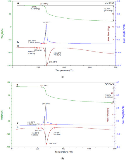 Figure 8a–d. A sharp endothermic peak at decomposition temperature reflects good crystallinity. A weak broad peak at 195.80 and 206.29 °C in GCSN2 and GCSN3 characterized phase change from