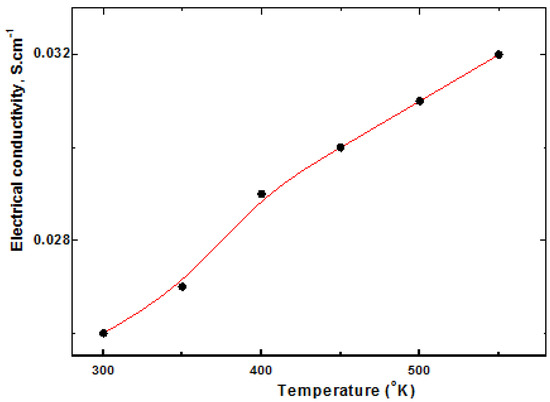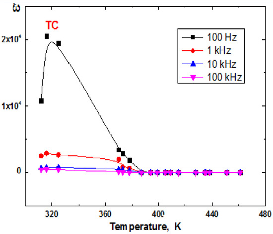 Figure 13 showed ε′ varied with temperature at a different frequency and decreased with increasing frequency, indicating an ability to dissipate incident IR radiation. ε′ decreased until it reached glass transition Tg at 380 K, then became limited up to 470 K. Peak at Curie TC represented phase transition from ferroelectric to paraelectric behavior.