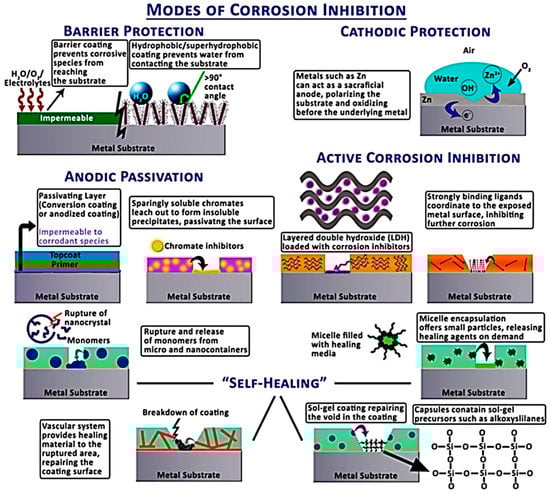 Schematic of various modes of corrosion inhibition such as barrier protection, cathodic protection, anodic passivation, active corrosion inhibition, and self-healing [31]. Reproduced with permission from IOP publishing.