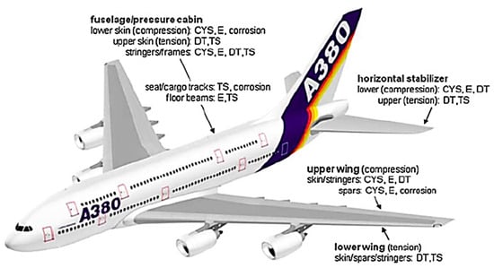 Engineering property requirements for the main structural areas of a transport aircraft, i.e., corrosion, fatigue, fatigue crack growth, fracture toughness. CYS = compressive yield strength; E = elastic modulus; TS = tensile strength; DT = damage tolerance properties [66]. Reproduced with permission from Springer.