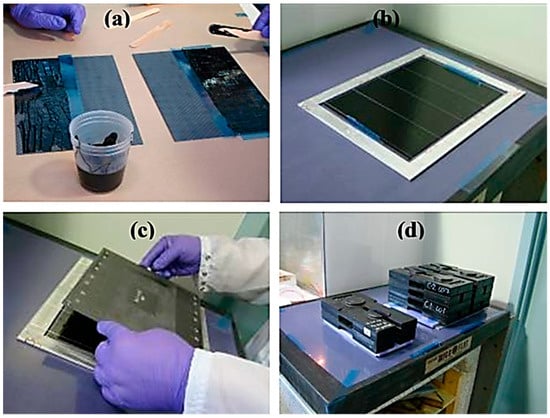 Formation of adhesive bonded panels using an adhesive composite with single-walled nanotubes, showing (a) spreading of adhesive onto peel test panels (covering half a panel), and (b–d) assembly of lap-shear test panels [92]. Reproduced with permission from Elsevier.