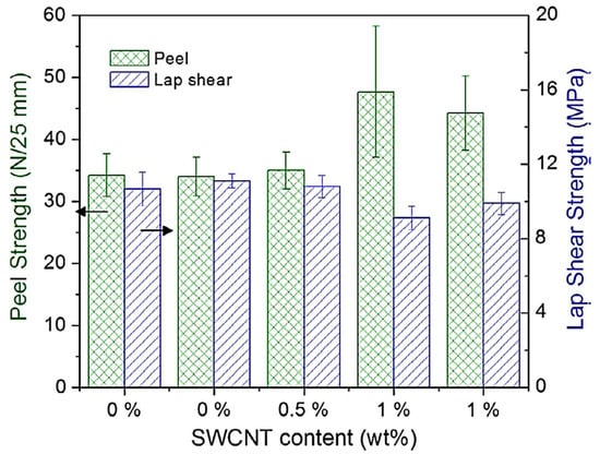 Due to their ability to withstand high temperatures, shocks, and corrosion, epoxy-based materials have been employed in the space sector [84]. Consequently, epoxy and other polymer-based nanocomposites have been considered for aerospace [85,86]. Epoxy nanocomposites depicted better corrosion resistance compared with neat epoxy coatings [87]. Ebrahimzad et al. [88] developed carbon nanotube-based coatings for improving the mechanical stability and corrosion resistance of aluminum for aerospace structures. Such coatings have been applied to enhance the life span of space-related metal alloys [89]. Asmatulu et al. [90] developed epoxy/multi-walled carbon nanotube nanocomposite coatings. The nanocomposite (1 mm thick) was coated on the aluminum surface for corrosion prevention. Epoxy/multi-walled carbon nanotube nanocomposites were tested in UV and salt fog chambers for moisture and chemical resistance. The contact angles of the nanocomposites with 0.25–2 wt.% nanofiller were investigated. A contact angle of 84–91° was observed for the coatings, indicating the hydrophobicity and anticorrosion properties of the nanocomposite material made for aerospace [91]. Jakubinek et al. [92] fabricated aerospace-grade epoxy and single-walled carbon nanotube-derived nanocomposites. Nanofiller contents up to ~1 wt.% were reinforced in the matrix. Figure 4 shows the fabrication of aerospace-grade epoxy/single-walled carbon nanotube nanocomposite adhesives. The nanomaterial was de-gassed prior to spreading on the panels. Lap shear and peel tests were performed on the nanocomposite adhesive samples. Figure 5 depicts the performance of adhesive joints with 0.5 wt.% nanofiller contents. With the reinforcement of 1 wt.% nanotube contents in the adhesive, the peel strength was found to be 30% higher than the neat polymer. The fine lap shear performance of the nanocomposites with 0.5–1 wt.% nanofiller loading was observed. The properties the revealed excellent application potential of this nanocomposite adhesive for the aerospace sector.