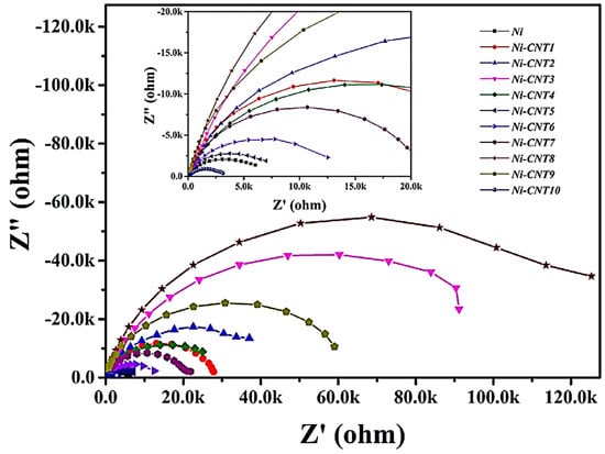 For the aerospace industry, nickel-carbon nanotube-based anticorrosion coatings have been designed [93]. Jyotheender and co-researchers [94] fabricated nickel–carbon nanotube-filled epoxy nanocomposite coatings for the corrosion resistance of space parts. Nyquist plots indicated the impedance measurements of the nanocomposite coatings (Figure 6). Semicircle capacitive loops were observed in the impedance curves. Inclusion of 7 wt.% nanofiller contents revealed a larger capacitive loop and impedance value, indicating effective corrosion prevention. It was suggested that the uniform nickel–carbon nanotube dispersion and matrix–nanofiller interface formation led to enhanced anticorrosion properties.