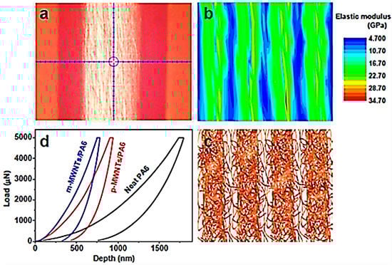 (a) The image of the sample after nanoindentation test; (b) elastic modulus contour map of cross section of polyamide/modified multi-walled carbon nanotube nanocomposite; (c) internal sandwich structure sketch of polyamide/modified multi-walled carbon nanotube; (d) loading–unloading curves of neat polyamide 6 (PA6), polyamide/purified multi-walled carbon nanotubes (p-MWNTs/PA6), and polyamide/modified multi-walled carbon nanotubes (m-MWNTs/PA6) [95]. Reproduced with permission from ACS.