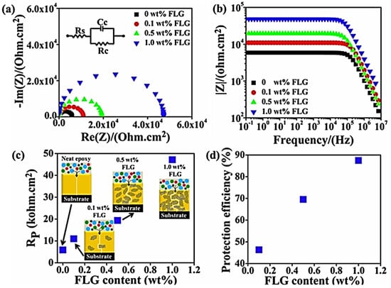 (a) Nyquist plot; (b) Bode plot; (c) change in polarization resistance (Rp); and (d) variation in protection efficiency of FLG-based nanocomposite coatings of different nanofiller contents [112]. FLG = few-layer graphene. Reproduced with permission from Elsevier.