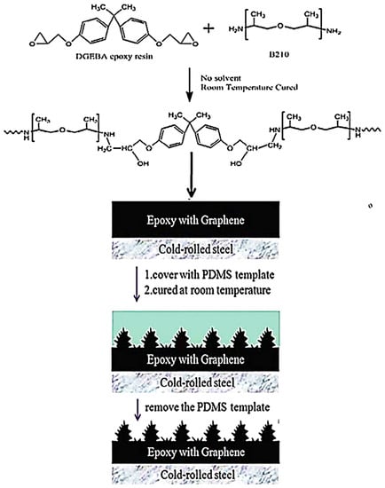 Nazir and co-researchers [115] designed epoxy and nickel-graphene based nanocomposite coatings on steel substrate. Their corrosion resistance features were studied using a molecular dynamics simulation. The anticorrosion properties were found to be adequate for aerospace applications. Chang and co-workers [116] designed a diglycidyl ether of bisphenol A epoxy resin and graphene-based nanocomposites. Hydrophobic epoxy and hydrophobic epoxy/graphene nanocomposites have been tested for their corrosion resistance performance. Cold-rolled steel and poly(dimethyl siloxane) was used as a substrate. A nanocasting technique was employed to develop the hydrophobic epoxy and epoxy/graphene nanocomposite coatings (Figure 9). Figure 10 illustrates the Nyquist plots of bare metal, epoxy, and nanocomposite coatings. The high impedance of the epoxy/graphene nanocomposite was attained from the large semicircle arc, relative to the neat epoxy and metal substrate. Figure 11 demonstrates the mechanism of the diffusion of O2 and corrosive molecules through the neat epoxy and the epoxy/graphene nanocomposite coating deposited on metal substrate. Fine graphene distribution in polymer matrix formed tortuous pathways for the permeation of corrosion molecules, and so the corrosion phenomenon was hindered [117]. In this way, several polymer/carbon nanotubes, polymer/nanodiamonds, and polymer/graphene-based anticorrosion coatings have been effectively developed for the aerospace sector.