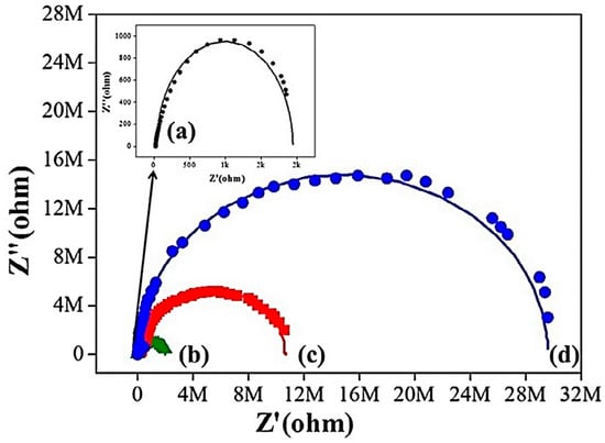 Nyquist plots for (a) bare metal; (b) epoxy-coated; (c) hydrophobic epoxy-coated; and (d) hydrophobic epoxy/graphene nanocomposite-coated cold-rolled steel [116]. Reproduced with permission from Elsevier.