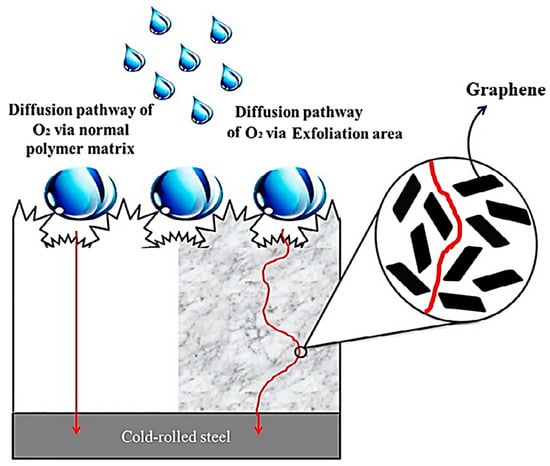 Schematic of hydrophobic surface and oxygen following a tortuous path through neat epoxy and hydrophobic epoxy/graphene nanocomposite [116]. Reproduced with permission from Elsevier.