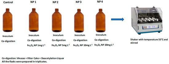 The different concentrations of Fe3O4 NP used in each bottle are described in Table 2 and are depicted in the diagram shown in Figure 1. The choice of concentrations was made based on studies with NP and AD that the literature shows [18,26]. It is worth mentioning that a control flask was made (Flaks 1-Table 2), adding only the inoculum and co-digestion, without NP, to compare with the other bottles that contained NP and to evaluate the optimization of the process. Analysis of variance (ANOVA) was used to identify the existence of significant differences between the treatments (p < 0.05).