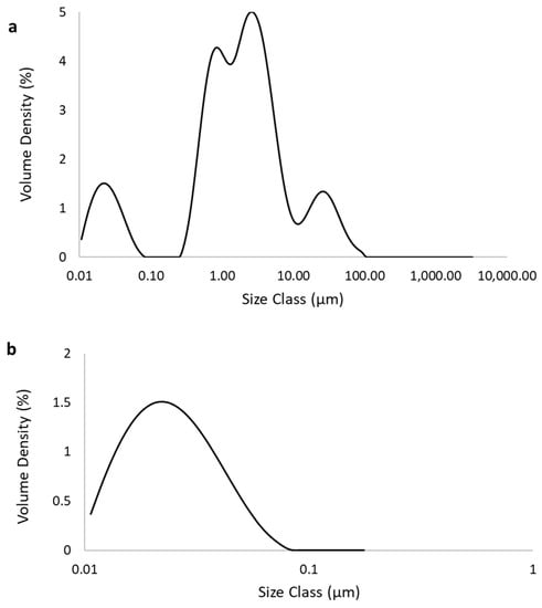 For better visualization, a cut in the graph was made of particles found only in nano size, which are shown in Figure 2b. The average size of these Fe3O4 NP was 23.56 ± 0.05 nm, which can be considered a greater size, as some authors have reported a decrease in CH4 production by using Fe NP greater than 55 nm [21,34].