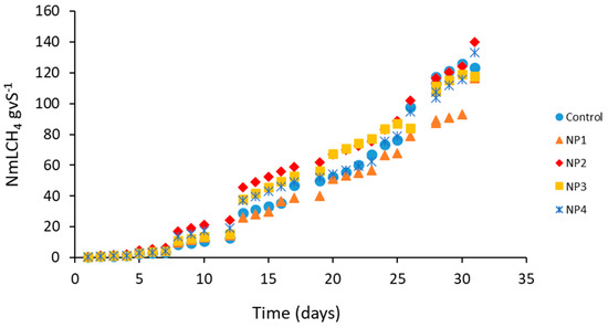Figure 4. Specific cumulative CH4 production according to the concentrations of Fe3O4 nanoparticle (NP) additions to co-digestion. NP1: 1 mg L−1; NP2: 5 mg L−1; NP3: 10 mg L−1; NP4: 20 mg L−1.