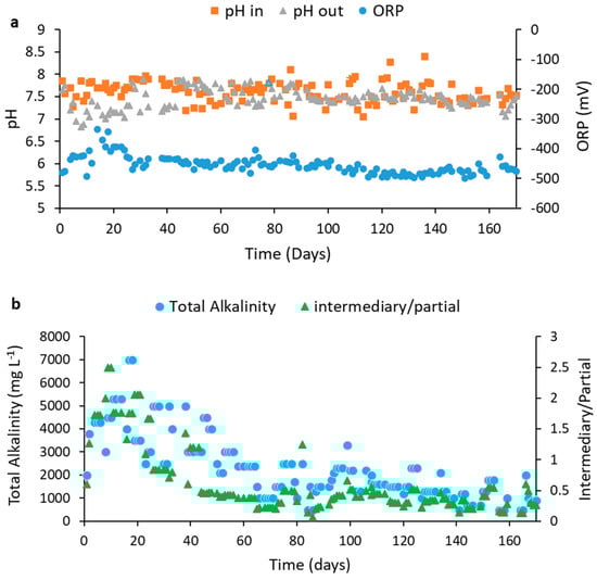 Figure 6. pH, Oxidation Reduction Potential (a) and Alkalinity (b) along with the reactor operation according to the applied OLRs (g VS L−1 day−1): 2.0 (Phase I); 2.35 (Phase II); 3.0 (Phase III); 4.0 (Phase IV); 4.7 (Phase V); 5.5 (Phase VI); 6.6 (Phase VII); 8.0 (Phase VIII); 9.0 (Phase IX).