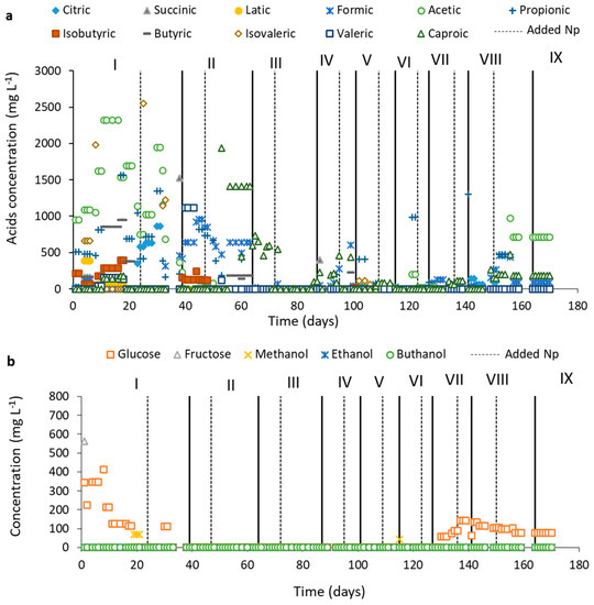 It is important to demonstrate that the practically constant ORP values are in agreement with the OA values (Section 4.3.2), which are in extremely low concentrations when the reactor stabilizes in methanogenesis. Here, it is worth emphasizing that the differences in the ORP values found in the literature vary due to the different raw materials applied, experimental conditions, and the type of NP used.