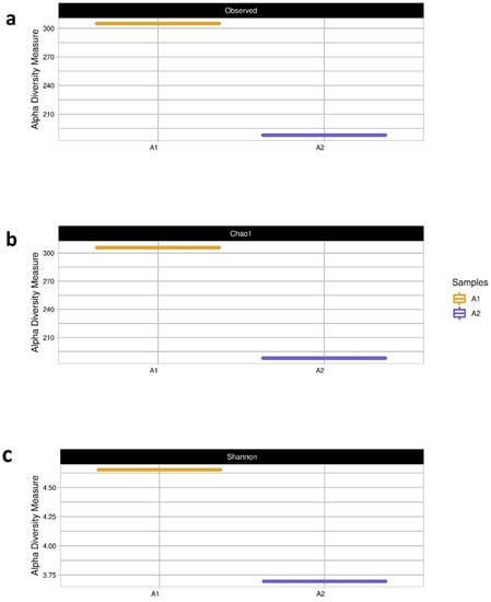 The Shannon index (Figure 8a) obtained from sample A1 was close to 5.0, while that from sample A2 was less than 3.75. As discussed by Volpi et al. [8], when the value of the Shannon index is greater than 5.0, it indicates greater microbial diversity in anaerobic digesters [50]. Thus, it can be seen that the A2 sample has a much lower microbial diversity than the A1 as these microorganisms are in stabilized metabolic routes for CH4 production, indicating that this microbial community is even more specific.