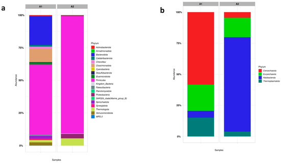 Figure 9 shows the results obtained from phylum for Bacteria order (a) and Archaea order (b) from samples A1 and A2.