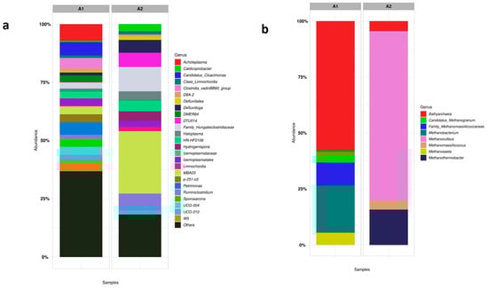 Figure 10 shows the main genera found for samples A1 and A2 to the Bacteria order (a) and the Archaea order (b). As previously discussed, the A1 sample presented a very large microbial diversity, with no genus that was predominant in the process concerning the Bacteria order. Its genera of microorganisms come from the main phyla (Bacteroidota, Cloacimonadota, Firmicutes) and are characteristic of acidogenic and hydrolytic processes.