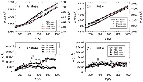 (a,b) Temperature evolution of a-axis and c-axis of P25 and black TiO2 for anatase and rutile tetragonal phases, respectively. (c,d) Experimental coefficient of thermal expansion (α) of P25 and black TiO2 for anatase and rutile tetragonal phases, respectively.