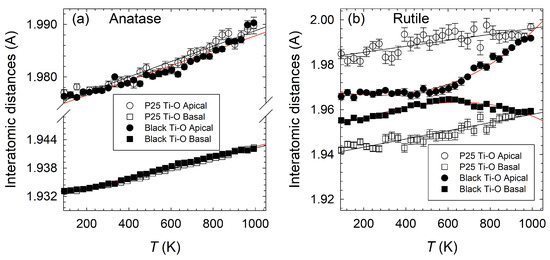 Conversely, the rutile form displays a more complex behavior (see Figure 4b). Basal and apical Ti-O distances in P25 exhibit a nearly linear behavior as a function of T, as observed in the anatase phase. The distances for the rutile black sample reveal a marked nonlinear increase with T indicating that the structure may undergo a strong reorientation of the crystal lattice associated with the modifications of H2 reduction. At T = 93 K, the difference between apical and basal Ti-O is less pronounced than the P25 sample; however, we noted a significant expansion related to black Ti-O basal distances. According to the mechanism proposed by Santara et al. [25], this provides direct experimental evidence of the expansion expected from the formation owing to the relaxation of Ti-O bonds around them. Above T = 600 K, the TiO6 units become progressively more distorted and both the apical and basal Ti-O distances in black tend to values found for the P25 sample at T~900 K.