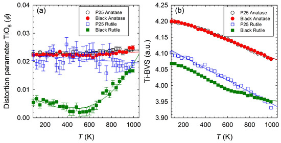 Figure 6a illustrates the T evolution of the order parameter ϕ for both anatase and rutile. In the case of anatase, particularly for the P25 and black, ϕ exhibits a relatively stable trend across varying T, with minor fluctuations as the transformation temperature is approached. This pattern is also observed in the P25 sample for the rutile phase. The evolution of the ϕ parameter for black rutile is markedly complex. Initially, at lower temperatures, the ϕ parameter for black rutile starts at a minimal value of approximately 0.005. As the T increases, ϕ decreases, indicating a transition towards a regime where TiO6 unit are more regular up to 600 K. Above this T, the ϕ parameter begins to increase, eventually aligning with the values observed for the P25 samples at the highest T (see Figure 6a).