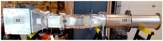 Air side of testbed photo: (1) induced blower on the left, (2) hydronic coil in the middle, and (3) Venturi on the right.