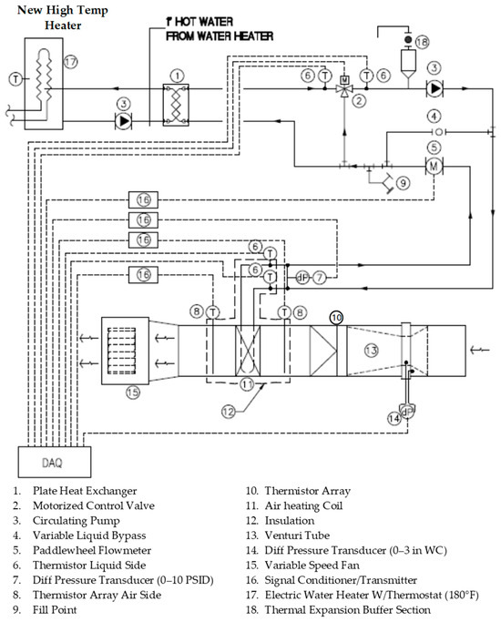 Foil-faced fiberglass batt insulation 5–7.5 cm in thickness covered the coil enclosure, while exposed tubing bends were insulated with EPDM foam wrap. The insulation was applied to minimize energy loss to the ambient air between all temperature sampling points. An inline paddlewheel flow meter measured liquid volumetric flow. Thermistors were installed in wells on the liquid lines immediately upstream and downstream of the coil inlet and outlet to measure entering and leaving liquid temperatures, respectively. A differential pressure sensor (strain-gage-type transducer) connected across the supply and return connections measures liquid static pressure change through the coil tubing. The air-side apparatus was configured with four thermistors arrayed on the heating coil air inlet and outlet to measure the entering and leaving air temperatures. These devices were manufactured by Ebtron Inc. (Loris, SC, USA) [20]. An in-duct calibrated Venturi tube manufactured by Lambda Square, Inc. (Babylon, NY, USA) [18] measured volumetric airflow. An electrically actuated control valve (item 3 in Figure 3) was used to maintain the liquid supply temperature to the coil. A closed-loop control circuit incorporating a LabView DAQ and control program, with PID (proportional/integral/derivative) control logic, provided highly accurate set point control of the coil hot glycol inlet temperature. The authors carried out the development of the control and data acquisition program. A schematic of the test bed components and the instrumentation is depicted in Figure 4.