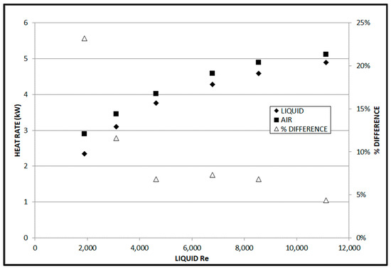 The relative humidity of the entering air was variable, which affected the thermophysical properties of the air and potentially impacted the energy balance calculations. Further discussion on the impact of humidity is presented in [7]. The relative humidity (RH) of the air during nanofluid testing ranged between 20–34%. Considering commonly available psychrometric data for the entering air conditions experienced here and using the energy Equation (1) for moist versus dry air, the difference in enthalpy change associated with heating moist air versus dry air under existing test conditions ranged between 0.9–1.5%. Therefore, dry air properties were deemed acceptable and used for this test’s calculations.