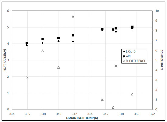 In the second baseline test, the inlet water temperature was varied, and the volumetric flow rate of the water and air was kept constant. The volumetric flow rate of liquid was held constant at 0.063 L/s while the airflow was constant at 0.222 m3/s. The result of this test is illustrated in Figure 6. The difference between the air-side and liquid-side calculated heat transfer rate ranges from 0.23% to 9.4%, with a mean of 3.4%. Here, the fourth data point near 342 K is an outlier. Disregarding this outlier, the average difference between energy balances comes to about 3%, an acceptable value for validating the test bed. For this test, the total number of data points is 902 (with between 64 and 192 observations at each temperature).