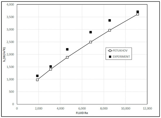 Comparison of heat transfer coefficients for water determined empirically and calculated using the Petukhov correlation [29].