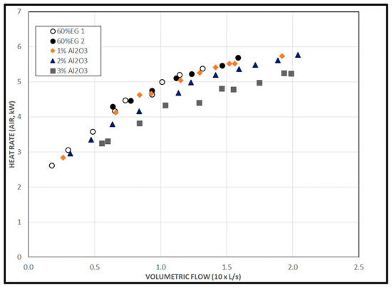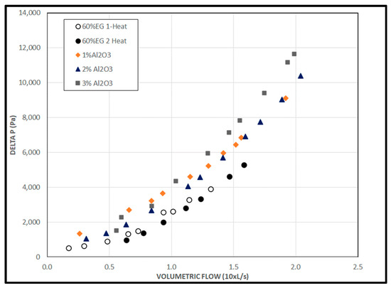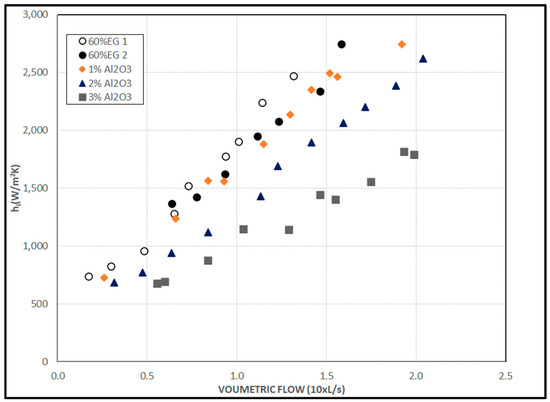 In the current experiment, the heat transfer coefficient decreases by 5.7%, 23.0%, and 44.3% for 1%, 2%, and 3% Al2O3/60% EG nanofluids, respectively, compared to the 60% EG base fluid, at a constant flow of 0.15 L/s (2.4 GPM). Due to nanofluids’ relatively higher viscosity, the Reynolds number at a given volumetric flow is generally lower than for the base fluid. According to well-established equations, the Nusselt number and the convective heat transfer coefficient are proportional to the Reynolds number for internal flows. Therefore, it is to be expected that the heat transfer coefficients for nanofluids are lower than for the base fluid when compared on a constant volumetric flow basis. Note in the legend of Figure 9 that two data sets for 60% EG were taken on different days.